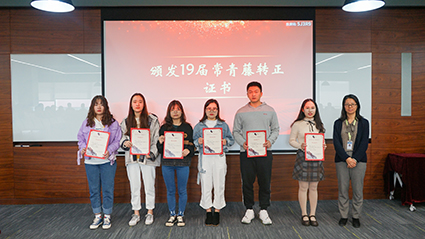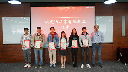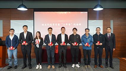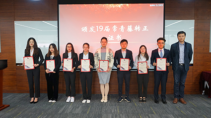 在授證及頒獎環節,各系統領導陸續上臺為19屆常青藤學員頒發轉正證書,并為18屆優秀個人頒發獎狀及“一年青”徽章。副總經理張翎親自為16屆學員頒發“3年香”紀念牌,寓意三年成長,如花綻放,碩果芬芳。至此,三年期滿,16屆“時間膠囊”正式開罐。
