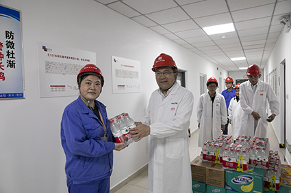 在恒廣路總部,公司黨委副書記兼工會副主席李曉春、黨委副書記兼紀委書記黃文藝、黨委委員張潔陪同楊義林參觀并慰問了員工食堂、倉儲中心、工程技術中心等高溫崗位。